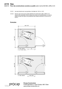 A114 Sas Pour des constructions ouvertes au public selon norme SIA 500, chiffre 3.3.5 3.3.5.1 Les sas doivent avoir une grandeur minimale de 1.40 m x 1.40 . 3.3.5.2 Dans le cas de sas avec portes…   /fileadmin/files/procap/Angebote/Beratung_Information/Bauen_und_Verkehr/Downloads/Merkblaetter_und_Checklisten/Oeffentlich_zugaengliche_Bauten/Tueren__Treppen_und_Aufzuege/Francais/A114_Sas_08_2019.pdf