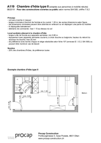 A119 Chambre d'hôte type II (adaptée aux personnes à mobilité réduite) 08/2019 Pour des constructions ouvertes au public selon norme SIA 500, chiffre 7.9.2 Principe - sol sans marche ni ressaut -…   /fileadmin/files/procap/Angebote/Beratung_Information/Bauen_und_Verkehr/Downloads/Merkblaetter_und_Checklisten/Oeffentlich_zugaengliche_Bauten/Gaestezimmer_und_Anprobierkabinen/Francais/A119_chambre_d_hotes_type_II_08_2019.pdf