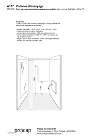 A117 Cabines d'essayage Pour des constructions ouvertes au public selon norme SIA 500, chiffre 7.3 Exigences L'une au moins des cabines d'essayage à usage général doit satisfaire aux exigences…   /fileadmin/files/procap/Angebote/Beratung_Information/Bauen_und_Verkehr/Downloads/Merkblaetter_und_Checklisten/Oeffentlich_zugaengliche_Bauten/Gaestezimmer_und_Anprobierkabinen/Francais/A117_cabines_dessayage_08_2019.pdf