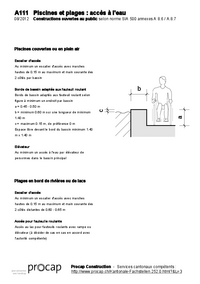 A111 Piscines et plages : accès à l'eau 08/2012 Constructions ouvertes au public selon norme SIA 500 annexes A 8.6 / A.8.7 Piscines couvertes ou en plein air Escalier d'accès Au minimum un escalier…   /fileadmin/files/procap/Angebote/Beratung_Information/Bauen_und_Verkehr/Downloads/Merkblaetter_und_Checklisten/Oeffentlich_zugaengliche_Bauten/Schul-_und_Sportanlagen/Francais/A111_Piscines_et_plages_08_2012.pdf