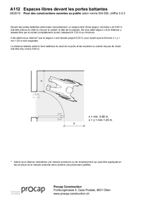A112 Espaces libres devant les portes battantes 08/2019 Pour des constructions ouvertes au public selon norme SIA 500, chiffre 3.3.3 Devant les portes battantes actionnées manuellement, un espace…   /fileadmin/files/procap/Angebote/Beratung_Information/Bauen_und_Verkehr/Downloads/Merkblaetter_und_Checklisten/Oeffentlich_zugaengliche_Bauten/Tueren__Treppen_und_Aufzuege/Francais/A112_Espaces_libres_devant_portes_08_2019.pdf