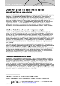 01/20 Fiche technique 401 L’habitat pour les personnes âgées – constructions spéciales La norme SIA 500 définit les exigences s’appliquant au logement adaptable. En cas de besoin, les adaptations…   /fileadmin/files/procap/Angebote/Beratung_Information/Bauen_und_Verkehr/Downloads/Merkblaetter_und_Checklisten/Oeffentlich_zugaengliche_Bauten/Francais/F401_Habitat_pour_les_personnes_agees_constructions_speciales_01_2020.pdf