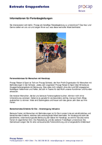 Betreute Gruppenferien Informationen für Ferienbegleitungen Sie interessieren sich dafür, Procap als freiwillige Reisebegleitung zu unterstützen? Das freut uns! Gerne stellen wir uns vor und zeigen…   /fileadmin/files/procap/Mitmachen/Dokumente/Einsatz_Reisen/Ferienbegleitung/2026_Infoblatt_Ferienbegleitung.pdf