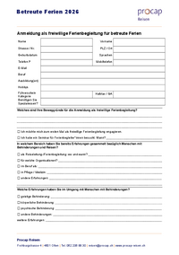 Anmeldung als freiwillige Ferienbegleitung für betreute Ferien Name FORMTEXT       Vorname FORMTEXT       Strasse / Nr. FORMTEXT      PLZ / Ort FORMTEXT       Geburtsdatum FORMTEXT      …   /fileadmin/files/procap/Mitmachen/Dokumente/Einsatz_Reisen/Ferienbegleitung/2026_Anmeldeformular_Ferienbegleitung.docx