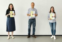 3 Mitarbeiter präsentieren die Plakate und Prospekte des Kita-Berichts.
