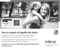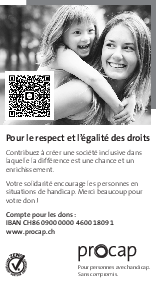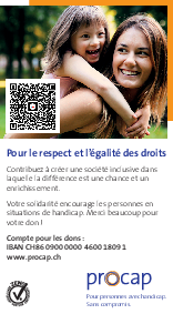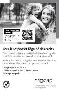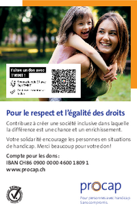 Pour le respect et l’égalité des droits Contribuez à créer une société inclusive dans laquelle la différence est une chance et un enrichissement. Votre solidarité encourage les personnes en…   /fileadmin/files/procap/Publikationen/Dokumente/Fuellerinserate/Spenden/Spenden_55x100mm_FR_2023_farbig.pdf