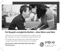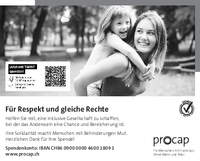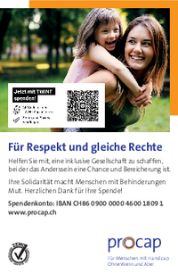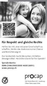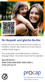Für Respekt und gleiche Rechte – ohne Wenn und Aber Helfen Sie mit, eine inklusive Gesellschaft zu schaffen, bei der das Anderssein als Chance und Bereicherung betrachtet wird. Ihre Solidarität macht…   /fileadmin/files/procap/Publikationen/Dokumente/Fuellerinserate/Spenden/20210125_Inserat_Spenden_143x115mm_schwarz_DE.pdf