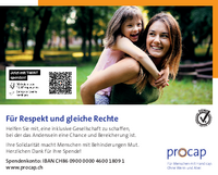 Für Respekt und gleiche Rechte Helfen Sie mit, eine inklusive Gesellschaft zu schaffen, bei der das Anderssein eine Chance und Bereicherung ist. Ihre Solidarität macht Menschen mit Behinderungen Mut.…   /fileadmin/files/procap/Publikationen/Dokumente/Fuellerinserate/Spenden/Spenden_143x115mm_DE_2023_farbig.pdf