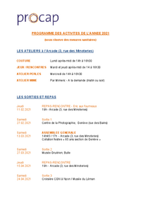 PROGRAMME DES ACTIVITES DE L’ANNEE 2021 (sous réserve des mesures sanitaires) LES ATELIERS à l’Arcade (3, rue des Minoteries) COUTURE Lundi après-midi de 14h à 16h30 JEUX / RENCONTRES Mardi et…   /fileadmin/files/procap/ueber_uns/Dokumente/Sektionen/Francais/20210209_Geneve_Programme_des_activites_2022.pdf