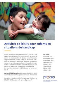 Activités de loisirs pour enfants en situations de handicap Durant 8 samedis de septembre 2021 à juin 2022 (voir dates ci-contre), les enfants en situations de handicap de 4 à 16 ans du canton de…   /fileadmin/files/procap/ueber_uns/Dokumente/Sektionen/Francais/20210907_Procap_Flyer_Activites_Enfants_GE.pdf