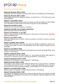 fribourg Programme d'activités 2023 Dimanche 29 janvier 2023 à 12h00 Crêpe party, suivi d’une surprise à la Crêperie Bach & Buch, Grand-Places 18 à 1700 Fribourg Dimanche 26 février 2023 à 12h00…   /fileadmin/files/procap/ueber_uns/Dokumente/Sektionen/Francais/20230227_Fribourg_Programme_des_activites_2023.pdf