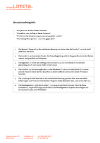 Situationsbeispiele - Was passt zur Rolle in dieser Situation? Was gehört zum Auftrag in dieser Situation? Wie könnte die Situation angemessen(er) gestaltet werden? Was bedingt Transparenz – und wem…   /fileadmin/files/procap/ueber_uns/Dokumente/Praevention/210907_Procap_Situationsbeispiele.pdf
