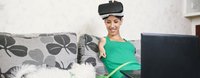 Eine junge Frau sitzt im Wohnzimmer und arbeitet am Computer
