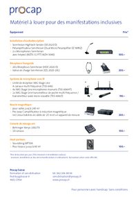 Matériel à louer pour des manifestations inclusives Équipement Prix* Installation d‘audiodescription >> Sennheiser Hightech-Sender (SR 2020 D) >> Préamplificateur Sennheiser (Dual Micro…   /fileadmin/files/procap/Angebote/Weiterbildungen_und_Kurse/Downloads/Kulturbereich/Francais/20210702_Preisliste_Mietgeraete_fr.pdf